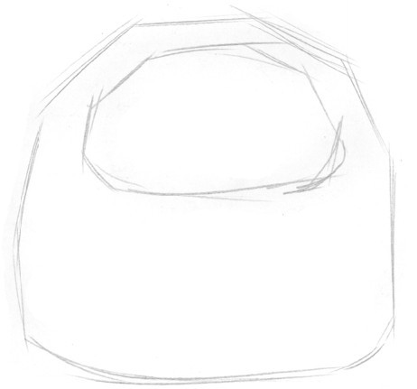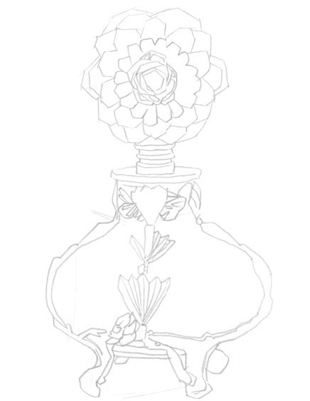 1 观察香水瓶瓶身与顶部装饰物的比例,用较硬的铅笔简单地勾勒出香水瓶的轮廓。