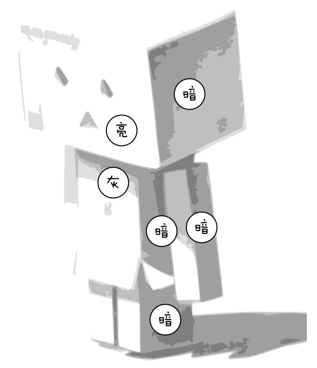 6 整体加强纸盒公仔的黑、白、灰关系,投影部分可以采用近实远虚的处理方法。