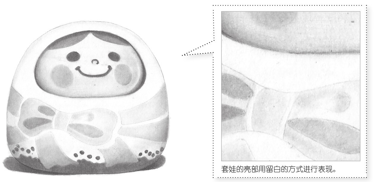 套娃的外观是几何体中的球体。绘制套娃的形体时,可以根据球体的明暗关系的变化规则进行绘制。根据光源的位置确定投影后,再进行描绘。
