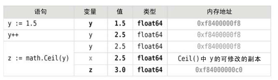 从概念上讲,变量是赋给一内存块的名字,该内存块用于保存特定的数据类型。因此如果我们进行一个短声明y := 1.5,Go语言就会分配一个足够放置一个float64数的内存块(8个字节)并将数字1.5保存到该内存块中。之后只要y还保存在作用域中,Go语言就会将变量y等同于这个内存块。因此如果我们在声明语句后面跟上一条y++ 语句,Go语言将修改变量y对应的内存块中保存的数值。然而如果我们将y传递给一个函数或者方法,Go语言就会传递一个y的副本。从另一方面来讲,Go语言会创建另一个与所调用的函数的参数名相关联的变量,并将y的值复制到为该新变量对应的新内存块中。