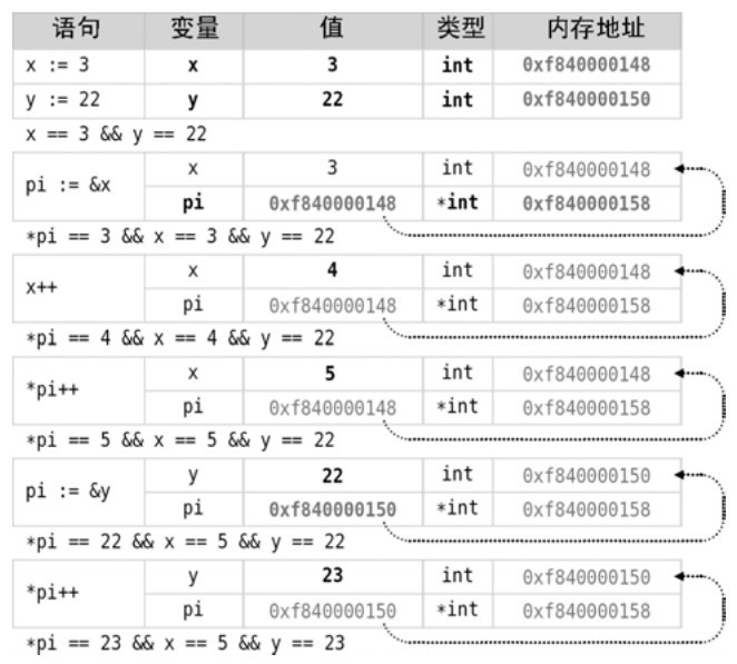 pi := &z // pi的类型为 *int(指向int型的指针)