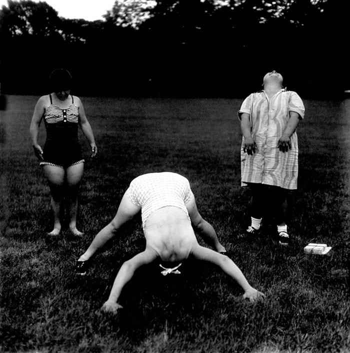 “你在街上看见某些人,”阿布斯写道,“而你在他们身上看到的基本上是缺陷。”不管阿布斯在多远的距离对准其典型的拍摄对象,她的作品坚持不懈的同一性都表明她那配备着相机的感受力可以巧妙地把痛苦、怪诞和精神病赋予任何被拍摄者。其中两幅照片是哭泣的婴儿,他们看上去焦躁、疯狂。根据阿布斯那种片面的观看方式的典型标准,酷似某人或与某人有某个共同点,是这些不祥者的通病。可能是在中央公园一起让阿布斯拍摄的两个穿着相同雨衣的女孩(不是姐妹),或出现在几张照片里的双胞胎或三胞胎。很多照片都带着令人窒息的惊诧指向一个事实,也即两人形成一对,每一对都是怪异的一对: 不管是异性恋者还是同性恋者,黑人还是白人,在老人院还是在初级中学。人们看上去稀奇古怪,是因为他们不穿衣服,例如裸体主义者;或因为他们穿衣服,例如裸体主义者营地那个穿围裙的女侍应。阿布斯拍摄的任何人都是怪异者——一名戴着硬草帽、佩着写有“轰炸河内”的纹章、等待加入支持战争的游行队伍的少年;老人舞会的舞王和舞后;一对伸开四肢瘫在草坪躺椅上的三十来岁的郊区男女;一名独自坐在凌乱的卧室里的寡妇。在《一名犹太巨人与他的父母在纽约布朗克斯家中,1970年》中,父母活像侏儒,他们的体形之不成比例一如他们那个在低垂的天花板下俯视着他们的巨人儿子。