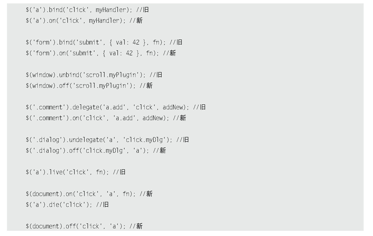 其中on替代了之前版本中的bind、delegate和live; off替代了unbind、undelegate和die。下面代码是新旧API调用之间对应的例子: