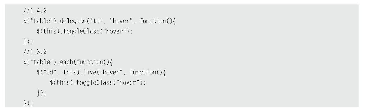 2010年2月,jQuery 1.4.2版发布,它新增了有关事件委托的两个方法:delegate和undelegate。delegate用于替代1.3.2中的live方法。这个方法比live来的方便,而且也可以达到动态添加事件的作用。比如给表格的每个td绑定hover事件,代码如下: