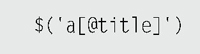 注意:XPath(XML Path Language, XML路径语言)是在XML文档中识别不同元素或者元素值的一种语言,与CSS在HTML文档中识别元素的方式类似。在涉及属性选择符时,jQuery使用了XPath中的惯例来标识属性,即将属性前置一个@符号并放在一对方括号中。例如,要选择所有带title属性的链接,可以使用下面的代码: