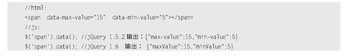 在jQuery1.5中,data方法可以用来将元素上的数据属性转化为JSON形式的值。JQuery 1.6已经更新了此功能,data方法获取的值会以驼峰形式展示,以配合W3C HTML5规范。比如: