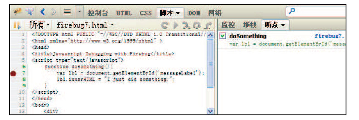 在脚本面板的右侧有“监控”、“堆栈”和“断点”3个面板,利用Firebug提供的设置断点的功能,可以很方便的调试程序。如图B-22所示。