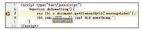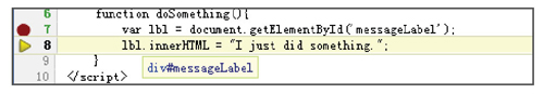 从上图可以看到,当鼠标移动到变量“lbl”上时,就可以显示出它的内容是一个DOM元素即“p# messageLabel”。