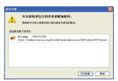 因为它是Firefox浏览器的一个扩展插件,所以首先需要下载Firefox浏览器,读者可以访问www.mozilla.com下载并安装Firefox浏览器。本书以Firefox 11.0为例。在安装完Firefox浏览器之后,用它访问https://addons.mozilla.org/zh-CN/firefox/addon/1843,进入图B-1所示的页面。点击“添加到Firefox”按钮,会弹出图B-2所示的对话框,然后单击“立即安装”按钮,最后重新启动Firefox浏览器即可完成安装。