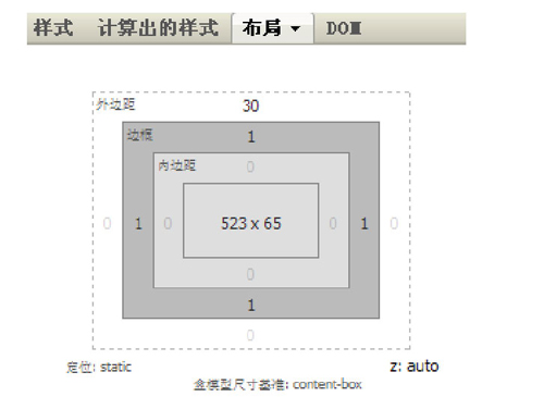 单击“布局”面板即可看到此元素具体的布局属性,这是一个标准的盒模型。通过“布局”面板,可以很容易地看到元素的偏移量、外边距、边框、内边距和元素的高度、宽度等信息,如图B-18所示。