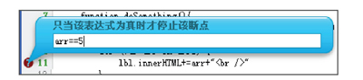 在“lbl.innerHTML+=arr+"<br/>"”这行代码前面的序号上单击鼠标右键,就可以出现设置条件断点的输入框。在该框内输入“arr==5”,然后按回车键确认,显示效果如图B-28所示。
