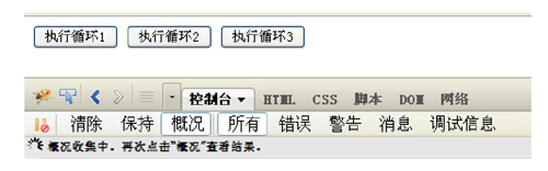 从上图中可以看到,Firebug中出现一行字,即“概况收集中。再次单击“概况”查看结果。”接着,单击“执行循环1”按钮1次,“执行循环2”按钮2次,“执行循环3”按钮3次,并再次单击“概况”菜单,即可看到图B-7所示的效果。
