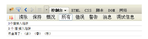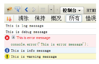 “清除”用于清除控制台中的内容。“保持”则是把控制台中的内容保存,即使刷新了还在。“所有”则是显示全部的信息。后面的“错误”,“警告”,“消息”,“调试信息”菜单则是对所有进行了一个分类。