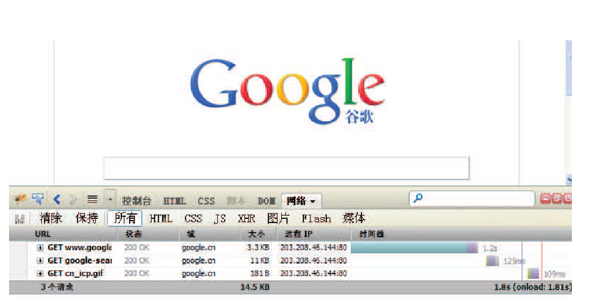 而在网络面板中,相对有一些强大的功能。例如打开Google网站中国首页,Firebug显示效果如图B-21所示。