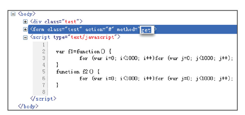 在页面中蓝色部分表示元素本身,紫色表示padding部分,而黄色表示margin部分。同时可以实时地添加、修改和删除HTML节点以及属性,如图B-12所示。另外,单击script节点还可以直接查看脚本,此处的脚本无论是内嵌在HTML中还是外部导入的,都可以查看到。同样这也适用于<style>标签内嵌或者导入的CSS样式和动态创建的HTML代码。