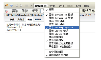 如果看不到任何信息出现,可能是将此功能关闭了,可以单击“控制台”旁边的下拉箭头,将“显示XMLHttpRequests”前面的勾勾选上,如图B-9所示。