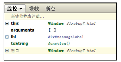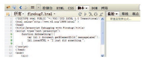 在脚本面板的右侧有“监控”、“堆栈”和“断点”3个面板,利用Firebug提供的设置断点的功能,可以很方便的调试程序。如图B-22所示。