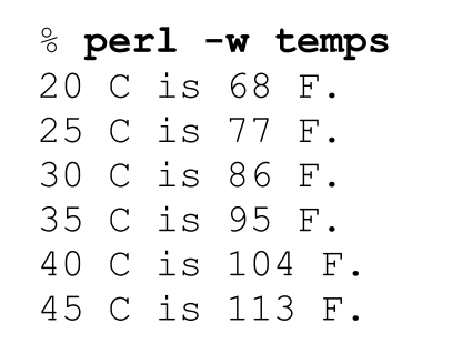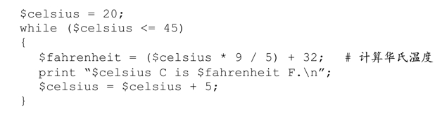 在条件为真(即$celsius <=45)时,while循环控制的部分会重复执行。把这段代码写入到一个程序中,例如temps,我们可以直接从命令行运行它。