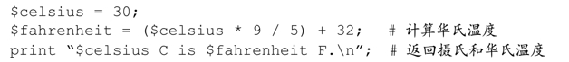 如果你曾经使用过C、C#或者Java、VB.NET,你可能无法理解在Perl中变量居然能够出现在双引号包围的字符串中。在字符串“$celsius C is $fahrenheit F.\n”中,每个变量都会被它的实际值所取代。在本例中,结果就是打印出来的字符串(\n代表换行)。