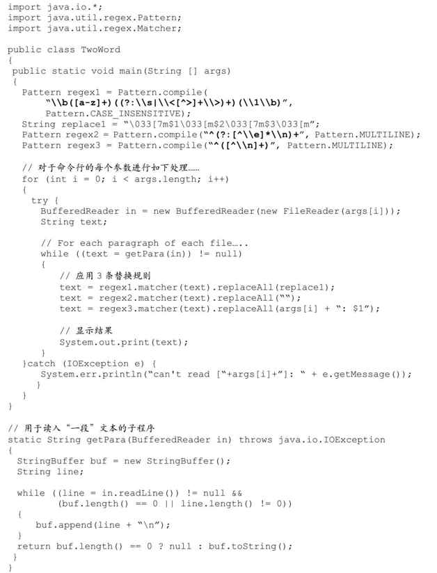 在程序的上部我们看到,在 Perl 中使用的 3 个正则表达式在 Java 中作为字符串传递给Pattern.compile程序。通过比较我们发现,Java版本的正则表达式包含了更多的反斜线,原因是Java要求正则表达式必须以字符串方式提供。正则表达式中的反斜线必须转义,以避免Java在解析字符串时按照自己的方式处理它们。