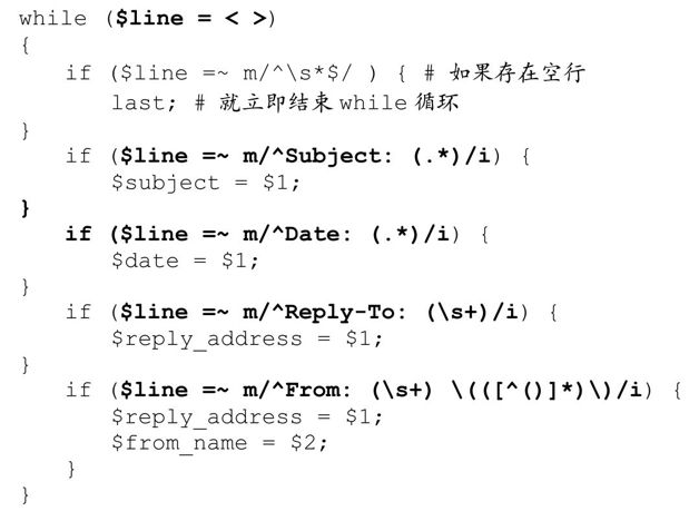这段代码尝试匹配一个以‘Subject:·’开头,但不区分Subject大小写的字符串。如果能够匹配,后面的「.*」匹配这一行的其他部分。因为「.*」在括号中,所以之后我们能用$1 来访问邮件的主题。在这个例子中,我们希望把它保存到变量$subject中。当然,如果正则表达式无法匹配这个字符串(大多数情况下都不能),结果就是 if语句返回结果为false,$subject变量没有变化。