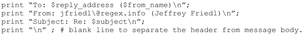 并非所有的E-mail信息都包含Reply-To字段,所以我们把$1暂定为回复地址。如果之后出现了$Reply-To字段,我们会重设$reply_address。综合起来就得到:
