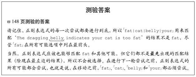 这里有一个小测验(应该不困难):如果用「fat|cat|belly|your」来匹配字符串‘The dragging belly indicates that your cat is too fat.’,结果是什么呢?ϖ请看下一页。
