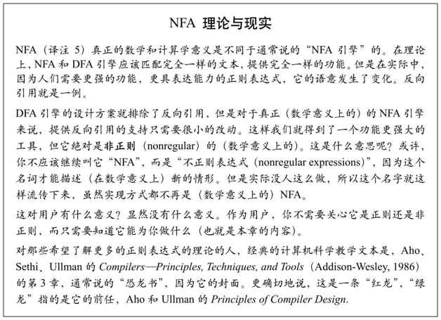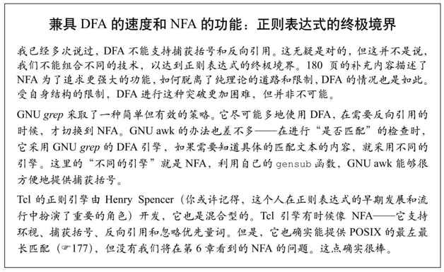 为了糅合DFA和NFA的优点,GNU egrep Version 2.4.2使用了两个功能完整的引擎(差不多8 900行代码),Tcl的DFA/NFA混合引擎(请看上一页的补充内容)更是长达9 500行。