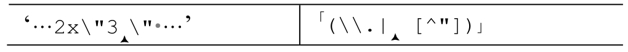 仔细想想正文里能够出现的字符,我们知道,如果一个字符不是引号,也就是说如果这个字符能由「[^"]」匹配,那么它肯定属于正文。不过,如果这个字符是一个引号,而它前面又有一个反斜线,那么这个引号也属于正文。把这个意思表达出来,使用环视(☞133)功能来处理“如果之前有反斜线”的情况,就得到「"([^"]|(?<=\\)")*"」,这个表达式完全能够匹配2\"x3\"。