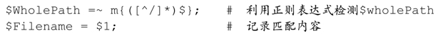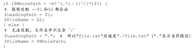 你也许注意到了,这里并没有检查这个正则表达式能否匹配,因为它总是能匹配。这个表达式的唯一要求就是,字符串有$能够匹配的结束位置,而即使是空字符串也有一个结束位置。因此,我用$1来引用括号内的表达式匹配的文本,因为它必定包括某些字符(如果文件名以斜线结尾,结果就是空字符)。