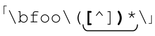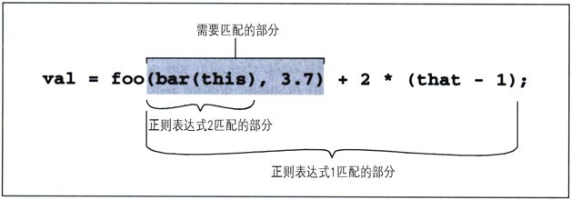 我们看到,第一个正则表达式匹配的内容太多(注2),第二个正则表达式匹配的内容太少,第三个正则表达式无法匹配。孤立地看,第三个正则表达式能够匹配‘(this)’,但是因为表达式要求它必须紧接在foo之后,所以无法匹配。所以,这三个表达式都不合格。