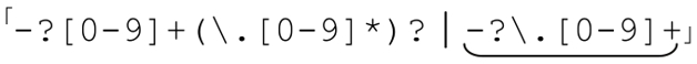 把它们结合起来,就得到「-?[0-9]+(\.[0-9]*)?」。这个表达式不能匹配‘.007’,因为它要求整数部分必须有一位数字。如果我们作些修改,容许整数部分为空,就必须同时修改小数部分,否则这个表达式就可以匹配空字符(这是我们一开始就准备解决的问题)。
