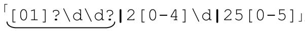 继续看这个正则表达式,以 2开头的三位数字,如果小于 255就是合法的,所以第二位数字小于5就代表整个数也是合法的。如果第二位数字是5,第三位数字就必须小于6。这可以表示为「2[0-4]\d|25[0-5]」。