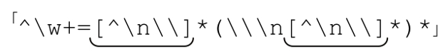 它确实能够匹配连续行,但因此也产生了一个新的问题:这样反斜线就不能出现在一行的非结尾位置。如果需要匹配的文本中包含其他的反斜线,这个正则表达式就会出问题。现在我们假设它会包含,所以需要继续改进正则表达式。