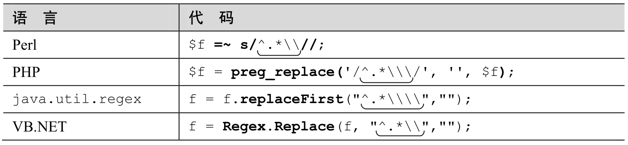 从中很容易看出各种语言的差异,尤其是Java中那4个反斜线(☞101)。