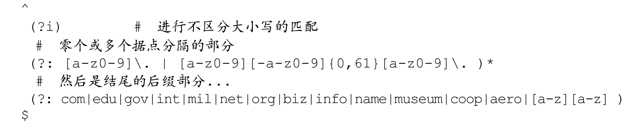 现在从另外一个角度来看主机名的匹配,我们可以用正则表达式来验证主机名。也就是说,我们需要知道,一串字符是否是形式规范、语意正确的主机名。按规定,主机名由点号分隔的部分组成,每个部分可以包括 ASCII 字符、数字和连字符,但是不能以连字符作为开头和结尾。所以,我们可以在不区分大小写的模式下使用这个正则表达式:「[a-z0-9]|[a-z0-9][-a-z0-9]*[a-z0-9]」。结尾的后缀部分(‘com’、‘edu’、‘uk’等)只有有限多个可能,这在第 2 章的例子中提到过。结合起来,下面的正则表达式就能够匹配一个语意正确的主机名: