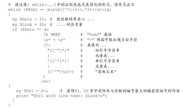 根据具体文本的不同,最后,URL 可能保存在$1、$2 或者$3 中。此时其他捕获型括号就为空或是未定义。Perl提供了特殊变量$+,代表$1、$2之类中编号最靠后的捕获文本。在本例中,这就是我们真正需要的URL。