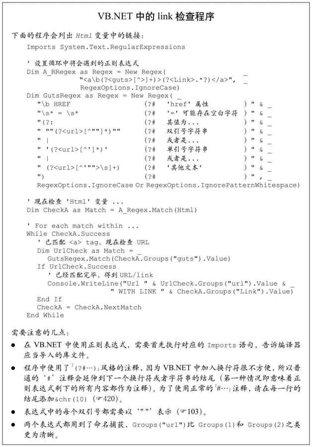 Perl 中的$+很方便,其他语言也提供了其他办法来选择捕获的 URL。常用的程序语言结构就可以检查捕获型括号,找到需要的内容。如果能够支持,命名捕获(☞138)最适用于干这个,就像204页的VB.NET的例子那样(幸亏.NET提供了命名捕获,因为它的$+有问题,☞424)。