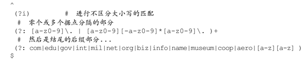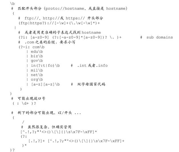 在这个正则表达式中,我们用「(?i:…)」和「(?-i:…)」用来规定正则表达式的某个部分是否区分大小写(☞135)。我们希望匹配‘www.OReilly.com’,但不是‘NT.TO’这样的股票代码(NT.TO是北电网络在多伦多证券交易市场的代号,因为要处理的是财经新闻和数据,这样的股票代码很多)。按规定,URL的结尾部分(例如‘.com’)可能是大写的,但我不准备处理这些情况。因为我需要保持平衡——匹配期望的文本(尽可能多的URL),忽略不期望的文本(股票代码)。我希望「(?-i:...)」只包括国家代码,但是在现实中,我们没有遇到大写的URL地址,所以不必这么做。
