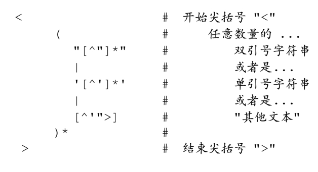 ‘<…>’中能够出现引用文本和非引用形式的“其他文本(other stuff)”,其中包括除了‘>’和引号之外的任意字符。HTML 的引文可以用单引号,也可以用双引号。但不容许转义嵌套的引号,所以我们可以直接用「"[^"]*"」和「\'[^\']*\'」来匹配。