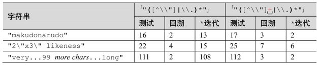 我们会在本章更深入地考察这个例子,不过看一眼统计数据会清楚地发现好处。图6-2展示了传统型 NFA 上应用这个例子的情况。比较原来的「"(\\.|[^\\"])*"」(上面的两个表达式),与多选结构相关的回溯和星号迭代都减少了。下面的两个例子说明,结合之前的重排序技巧,这种修改会带来更多的收益。