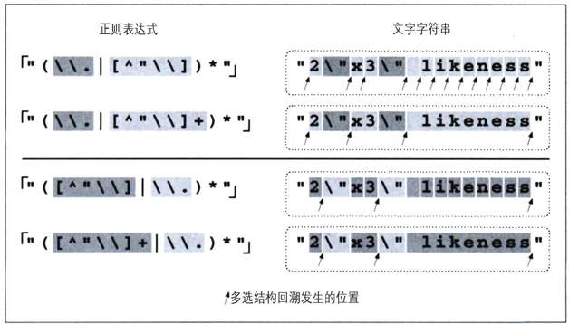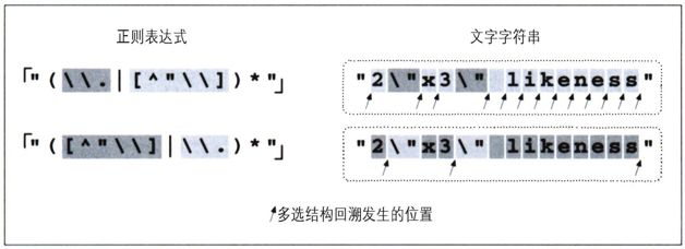 对于一般的双引号字符串来说,普通字符的数量比转义字符要多,一个简单的改动就是调换两个多选分支的顺序,把「[^\\"]」放到「\\.」之前。这样,只有在遇到字符串中的转义字符时才会按照多选结构进行回溯(还有一次回溯是星号无法匹配引起的,此时所有的多选分支都匹配失败,所以整个多选结构无法匹配)。图6-1说明了其中的差异。箭头数量的减少,说明第一个多选分支的成功匹配次数增加了,也就是说回溯的次数减少了。