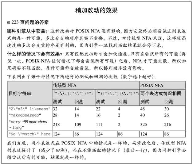 前面列出的几点表明,如果排除某些高级优化的影响,就能根据正则表达式的相对性能判断引擎的类型。这就是第4章中(☞146)我们能用某些正则表达式来“测试引擎的类型”的原因。