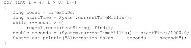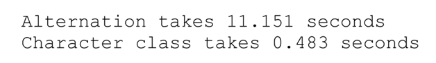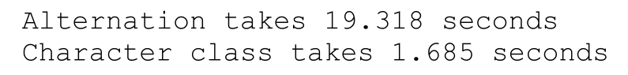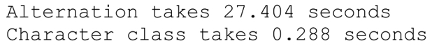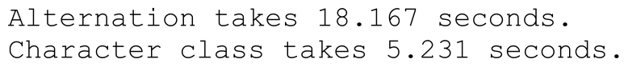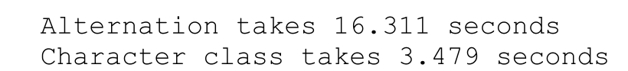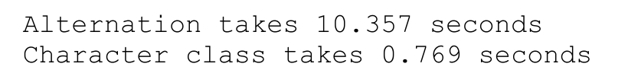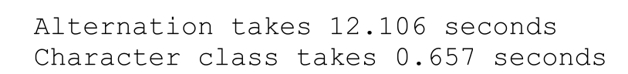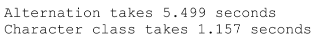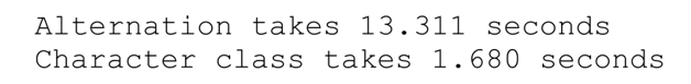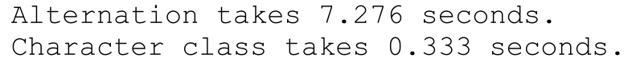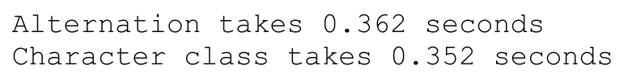 对于字符组测试来说,新增的开销花费了大约5s的时间,而多选结构则增加了将近10秒。为什么多选结构测试的时间变化如此之大?主要是因为捕获型括号(在每次测试之前和之后,它们都需要额外处理,这样的操作要多1 000倍)。