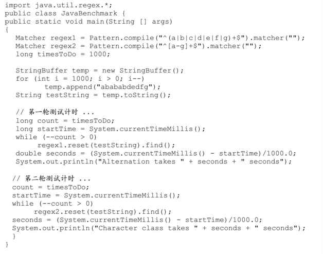 你注意到在这个程序中正则表达式如何初始化部分编译了吗?我们需要测试的是匹配的速度,而不是编译的速度。