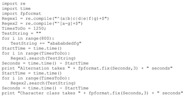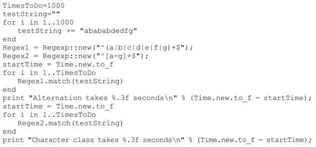 基本的性能测试就是记录程序运行的时间:先取系统时间,运行程序,再取系统时间,计算两者的差,就是程序运行的时间。举个例子,比较「^(a|b|c|d|e|f|g)+$」和「^[a-g]+$」。先来看Perl的表现,然后再来看其他语言。下面是简单的Perl程序(不过,我们将会看到,这个例子有欠缺):