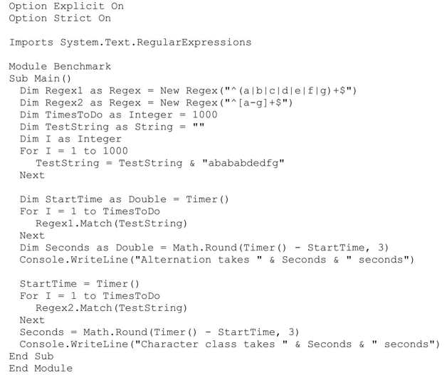 在.NET Framework中使用RegexOptions.Compiled作为正则表达式构造函数的第2个参数,能够把正则表达式编译为效率更高的形式(☞410),其结果为: