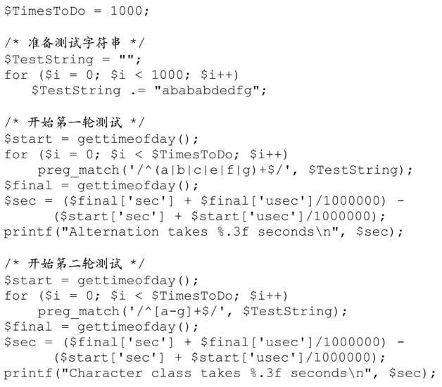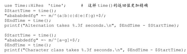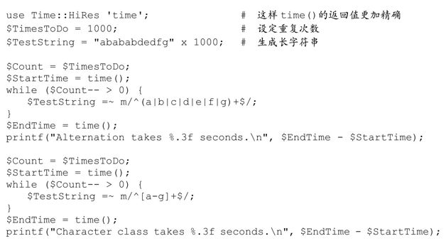 ●进行“准确的”处理。进行1 000万次快速操作需要在负责计时的代码块中升级1 000万次计数器。如果可能,最好的办法是增加真正的处理部分的比例,而不增加额外的开销。在Perl的例子中,正则表达式应用的文本相当短:如果应用到长得多的字符串,在每次循环中所作的“真正的”处理也会多一些。