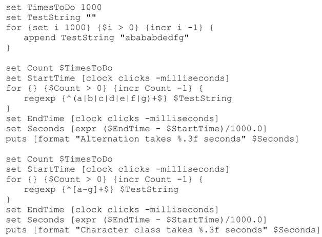 神奇的是,两者速度相当。还记得吗,我们在第145页说过,Tcl使用的是NFA/DFA混合引擎,对DFA引擎来说,这两个表达式是没有区别的。本章所举的大部分例子并不适用于Tcl,详细信息请参考第243页。