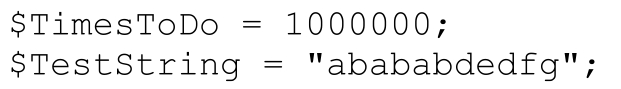 请注意,$TestString和$Count的初始化在计时开始之前($TestString使用了Perl提供的 x 操作符进行初始化,它表示将左边的字符串重复右边的次数)。在我的机器上,使用Perl5.8运行的结果是: